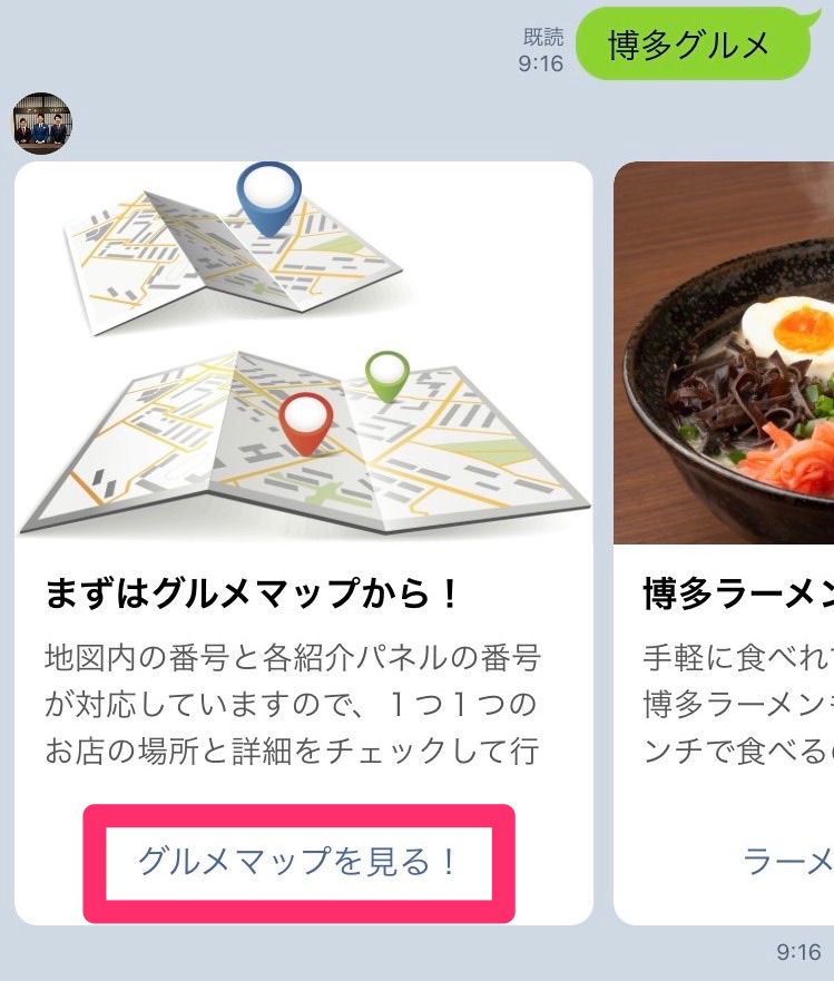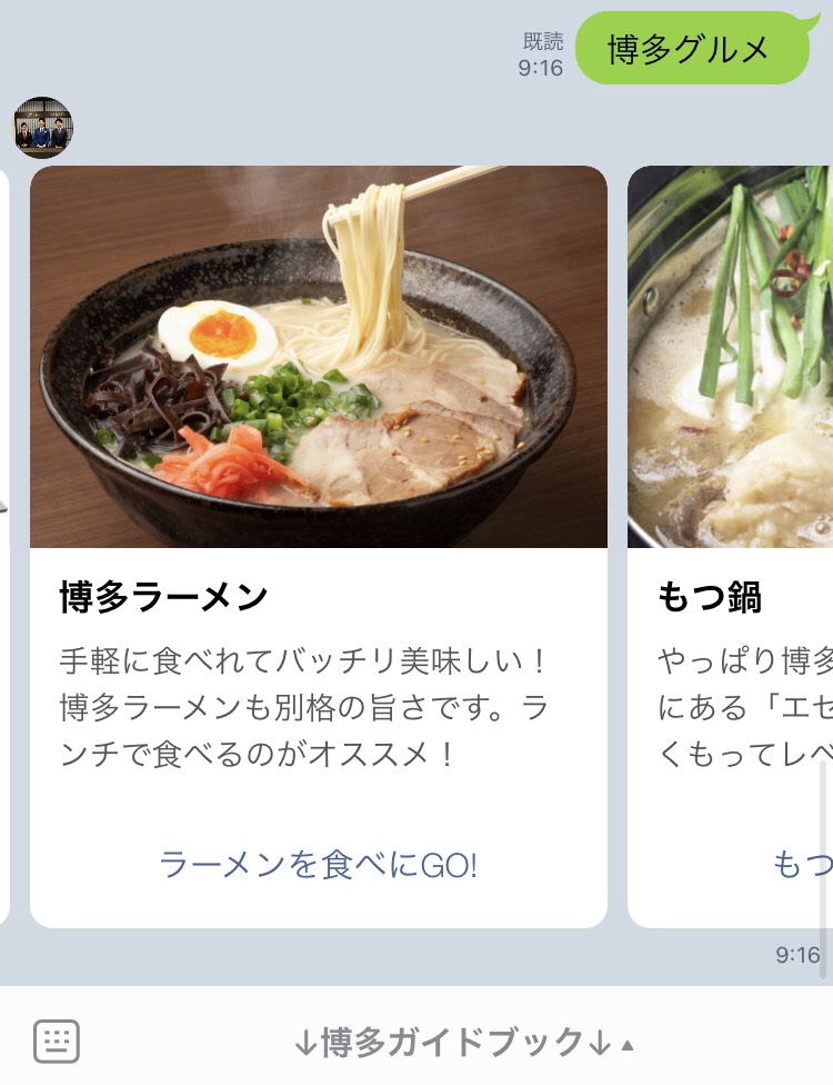 LINEから博多のグルメ情報を調べられる設計にしています↓