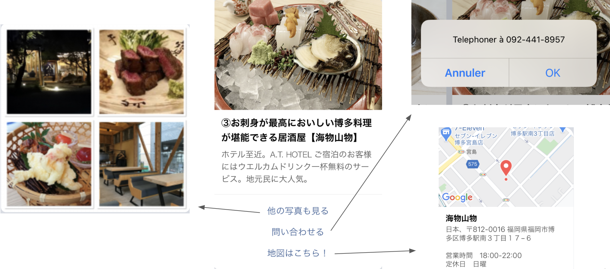 A.T HOTEL HAKATAのLINE公式アカウントでは、Googleマップとリンクさせて博多の美味しいグルメが案内されるようになっています。