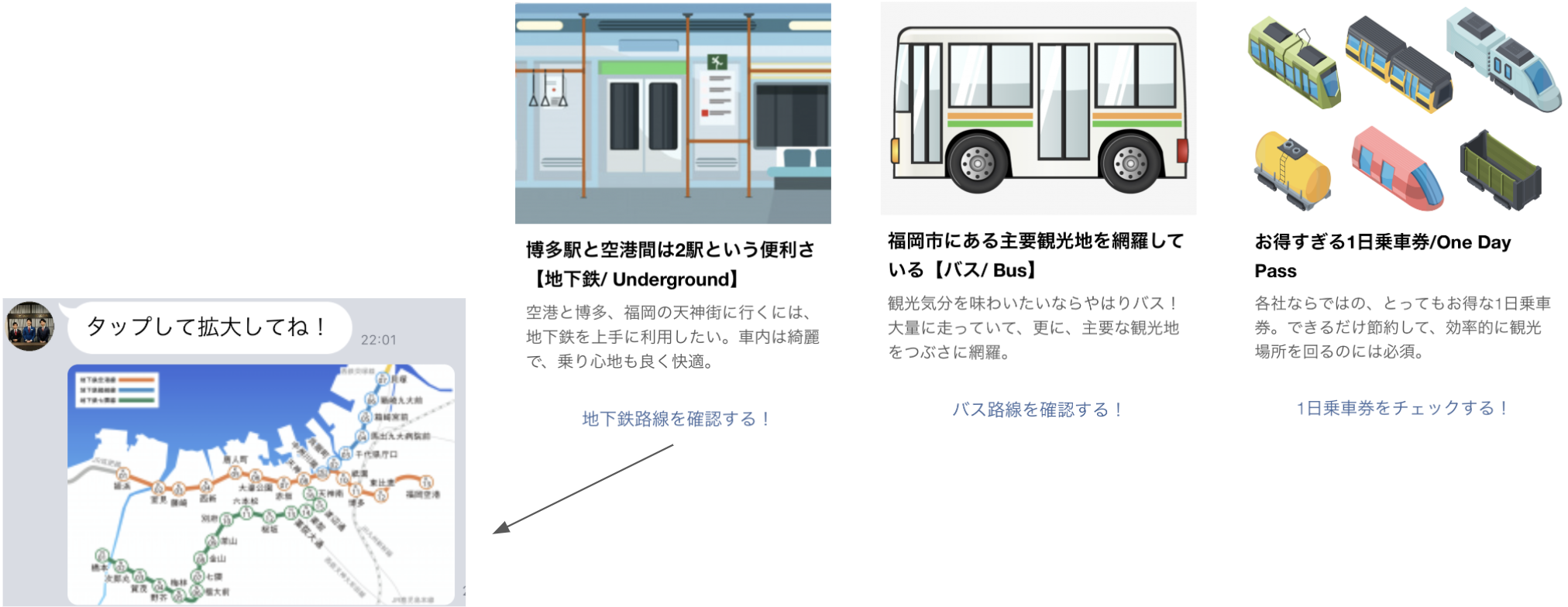 グルメブックやお土産リスト、博多交通マップまで、博多を満喫するための公式LINEとなっているので、滞在時にLINEを使って博多を満足いくまで楽しんでもらうためのLステップを構築しました。