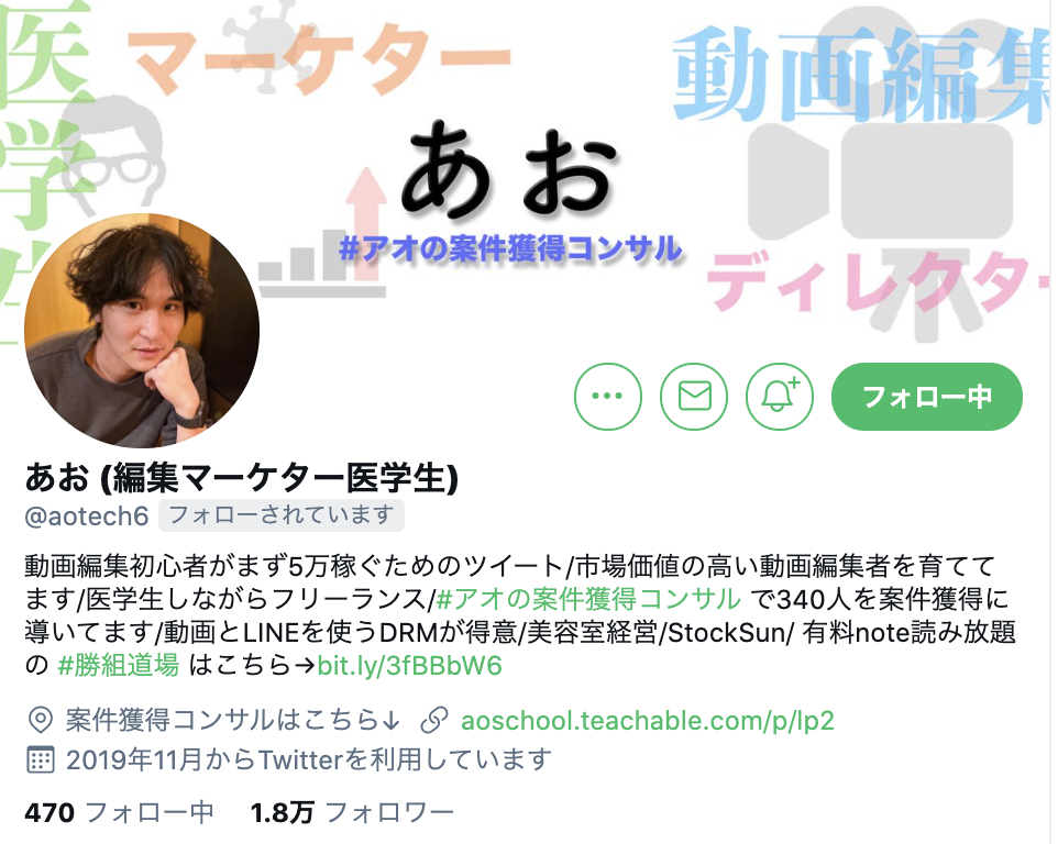 三人目が、Twitter上のインフルエンサーとして、動画編集者向けの案件獲得スクールを運営するあおさん(@aotech6)です。