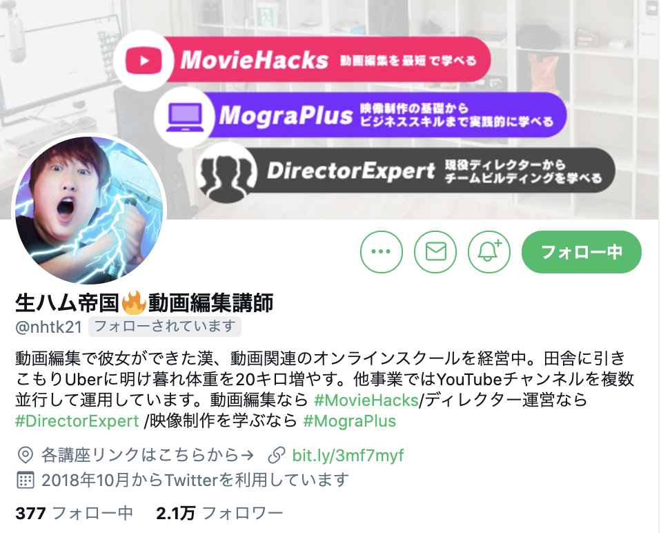 二人目が、MovieHacksというYouTubeに特化した動画編集の講師を務める生ハム帝国さん(@nhtk21)です。
