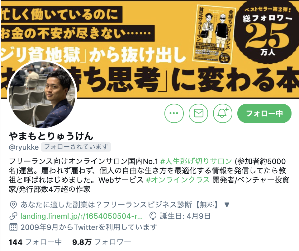まず一人目が、Twitterのフォロワーが9万人を超え、参加者4,500名を超える副業コミュニティ「人生逃げ切りサロン」のオーナーであるやまもとりゅうけんさん(@ryukke)です。