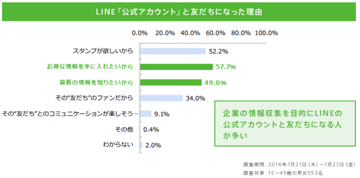 以下は、ユーザーが公式アカウントを友だち登録した理由のデータ。「お得な情報が欲しい」「最新の情報が欲しい」という2つの割合が高いです。