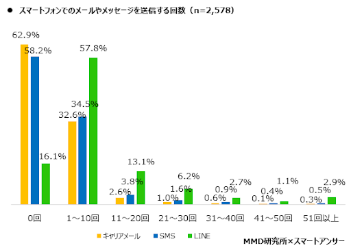 対して、LINEは1日1回以上送る人の割合が多いことがわかりますね。