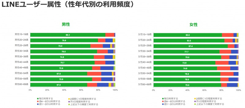 LINEはユーザーの約8割が毎日利用し、高齢層でも6割〜7割の利用率です。
