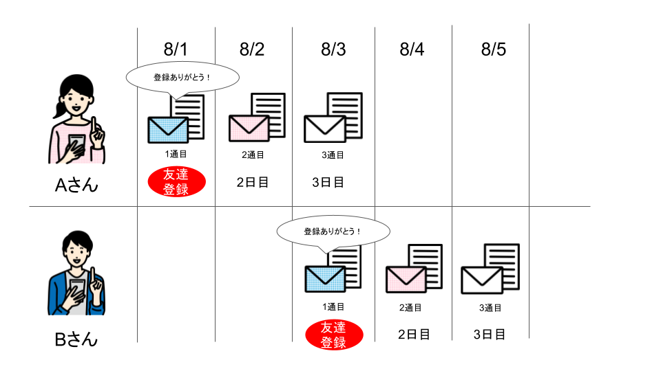 ステップ配信は、通常の全体への一斉配信とは異なる配信方法です。あらかじ用意しておいた複数のメッセージをシナリオ化させ、決められたタイミングで自動配信する方法です。
