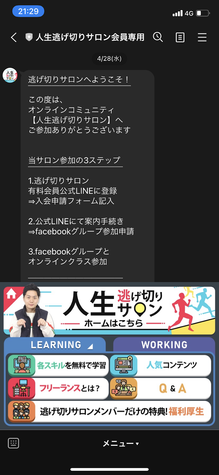 最後は僕が実際に手がけた事例を紹介します。SNSのインフルエンサーやまもとりゅうけんさんのLINE公式アカウントにて、ご自身のオンラインサロン「人生逃げ切りサロン」の集客につなげている実例です。