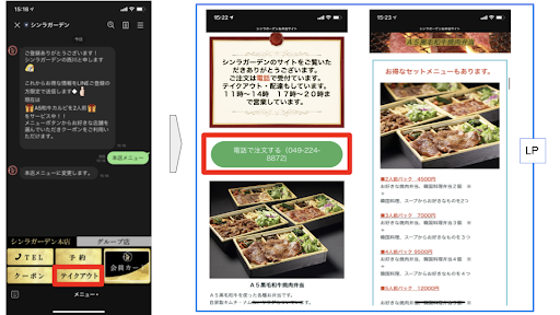 ↓リッチメニューのテイクアウトから、LPへの誘導を手間にならないように構築。予約導線となる電話のボタンもわかりやすくし、豊富なメニューも案内しました。