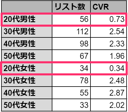 これを見れば、「20代に対する訴求の効率が悪い」ってことが一目でわかっちゃいますよね。