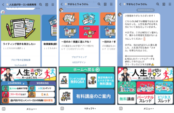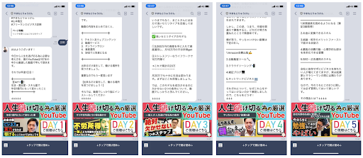 例えば、僕が構築やマーケティングを担当させていただいた、人生逃げ切りサロンのオーナーであるやまもとりゅうけんさんのLINEでは、あらかじめLINEに登録した人に自動で配信されるシナリオを作成し、自身のオンラインサロンへの集客や販売を自動化しました。