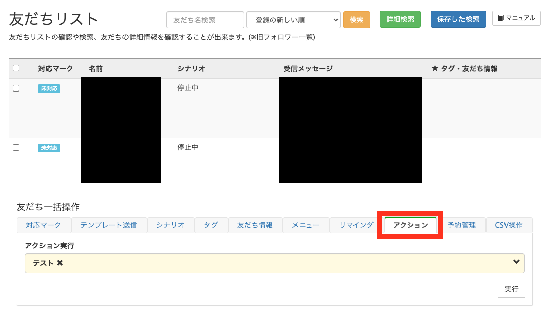 アクション管理は友だちリストでしか動かせないので注意しましょう。
