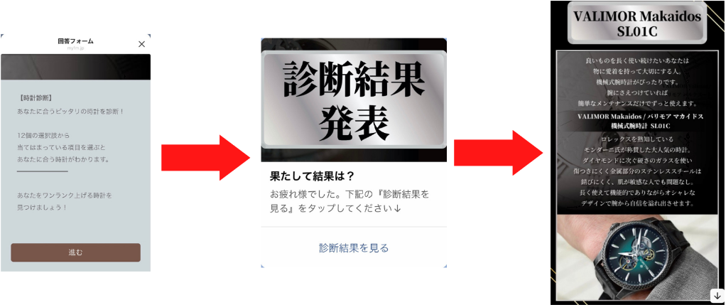 実際にこちらのアカウントでは、回答フォーム画面にあえて長文を掲載して商品の魅力をアピール。「ベストマッチ時計診断」と称した診断コンテンツと組み合わせて、顧客に時計を選ぶワクワク感を提供しています。