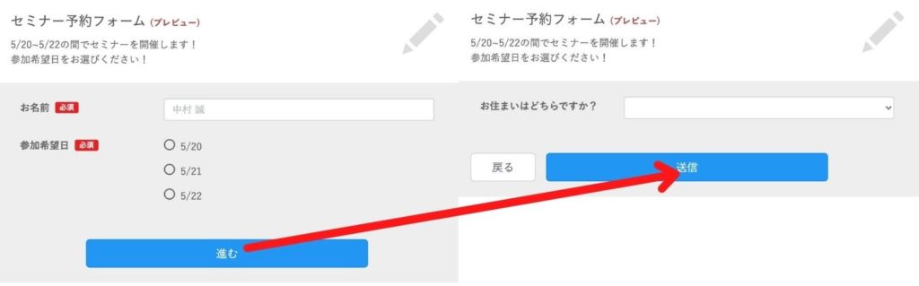 セクション機能を使うと送信ボタンが「進む」ボタンに変わり、2枚目の回答フォームに切り替わります。すると最初は1枚目しか見えないのでサクッと回答してもらえるうえ、2枚目も「1枚回答しちゃったし、2枚目もやるか」と勢いよく進めてもらえるでしょう。