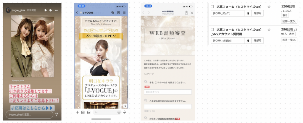 キャバクラ「 J-VOGUE」のアカウントでは、回答フォームを活用してLINEで仕事に応募できる仕組みを構築しています。