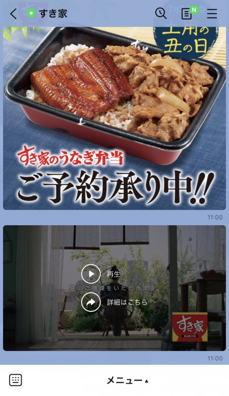 チャット欄に直接動画を表示させられるので、すき家のLINE公式アカウントのようにチャット欄から動画を視聴できます。