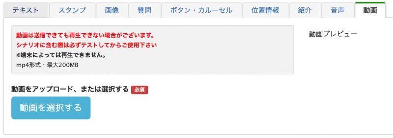 また、Lステップにアップロードする動画はmp4のみで、容量を200MB以下に抑える必要があるので注意してください。