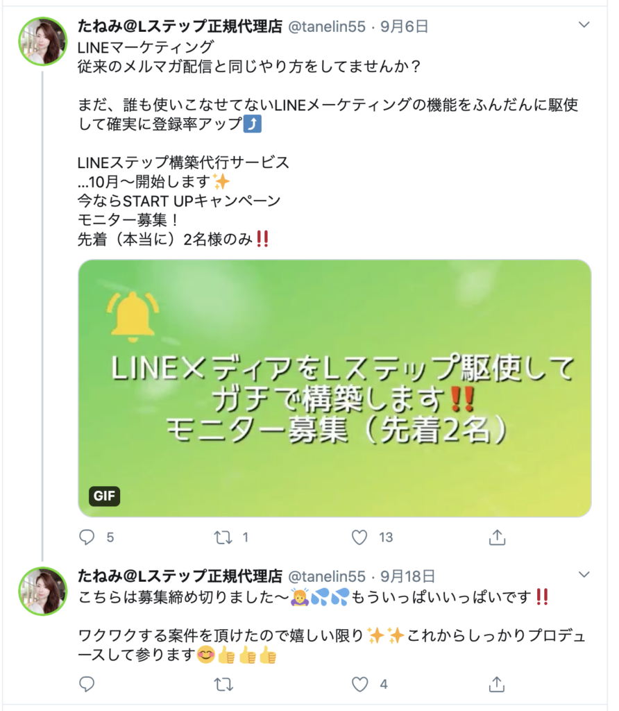 例えば、Twitter上で「Lステップの構築代行」や「LINEマーケティング」に関する情報発信をしつつ見込み客を集めるのも良いでしょう。過去にはあのビジネスインフルエンサーのイケダハヤトさんが、Lステップの構築プランを募集してたこともありました笑