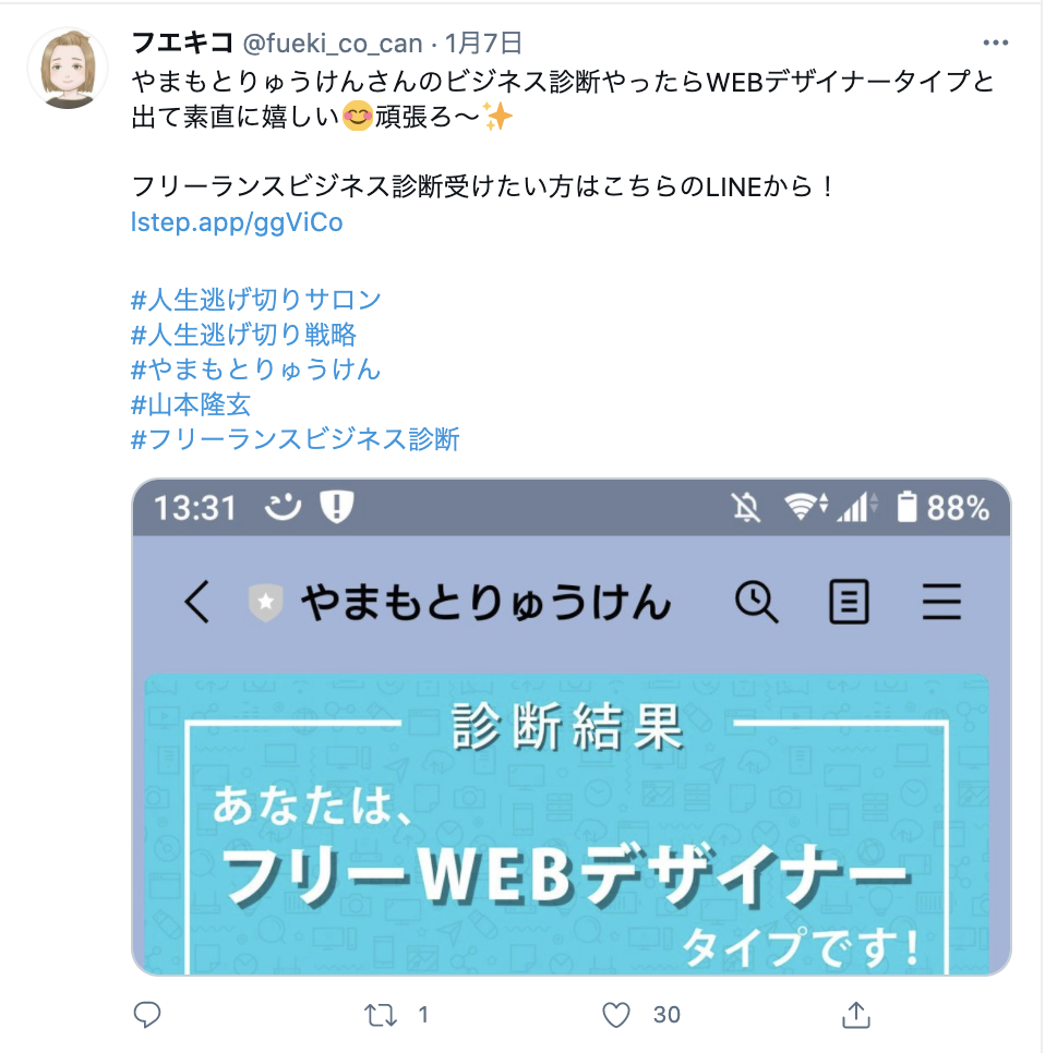 作った作品が広告となり、それが周りへの宣伝になることです。例えば、僕が作ったりゅうけんさんのLステップのフリーランスビジネス診断。