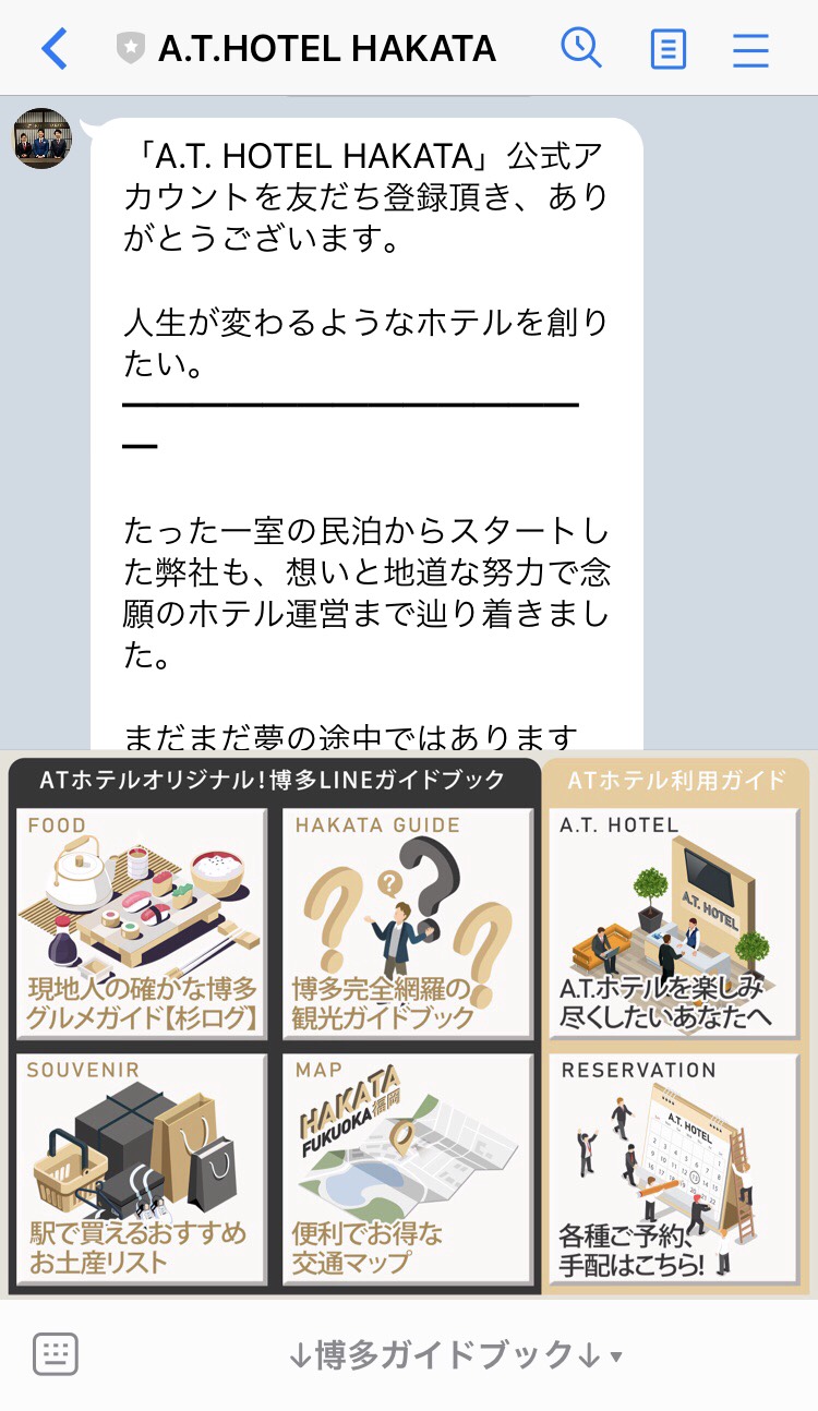 こちらは僕が作った博多のホテルのアカウントです。ガイドブックの機能もついているので、せひ参考にしてください。