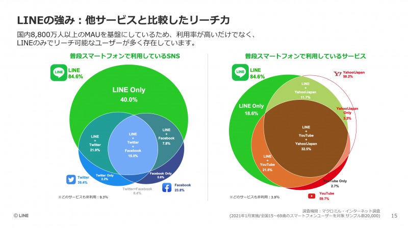 その結果「LINEでしかアプローチできない層」が多く、マクロミル社が2021年1月に行った全国15~69歳のスマートフォンユーザーを対象とした調査によると、普段LINEしか使用しない層は全体の40%にも登ります。