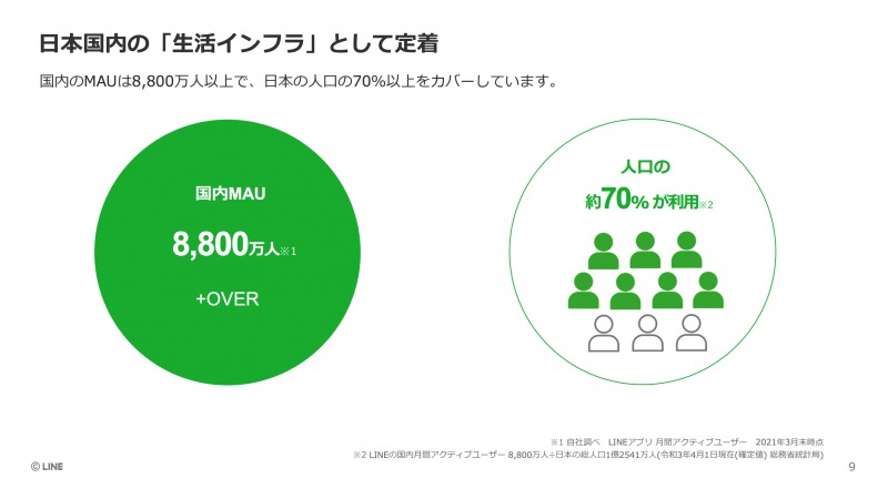 2021年3月時点の調査によると、国内のLINEユーザーは8800万人を誇り、人口の約7割をカバーしています。