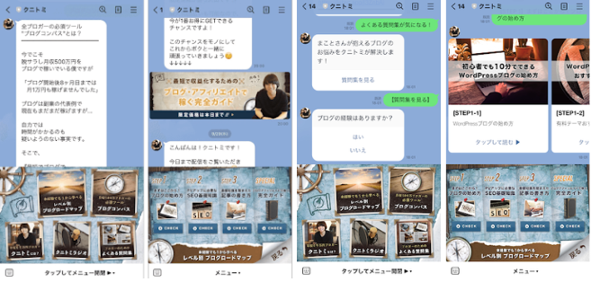 対する非サロンメンバー用のリッチメニューでは、入会を迷っているユーザーに対して講座紹介や副業適性診断のリンクを設置し、入会を後押しするような設計に。このように、Lステップならユーザーにとって意味のない情報が表示されないように属性ごとにコンテンツを差し替えられるので、継続的に意味のある情報を出し続けられます。