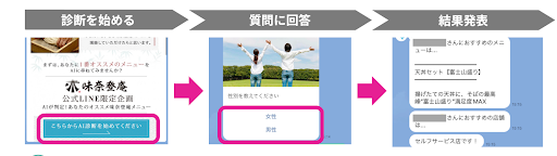 「診断」という形にすることでアンケート感をなくし、ユーザーに興味を持ってもらえるように工夫しています。また選択肢も「はい」「いいえ」だけではなく、親近感あるテキストにしているのもポイント。さらに全ての操作がLINEの画面上で完結できるため、ユーザーの負担も低いでしょう。
