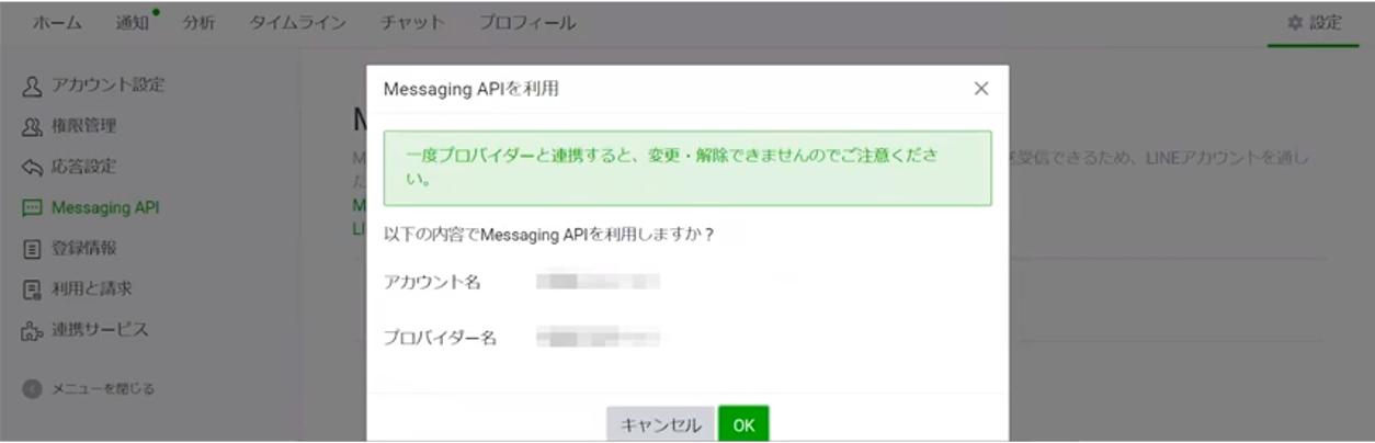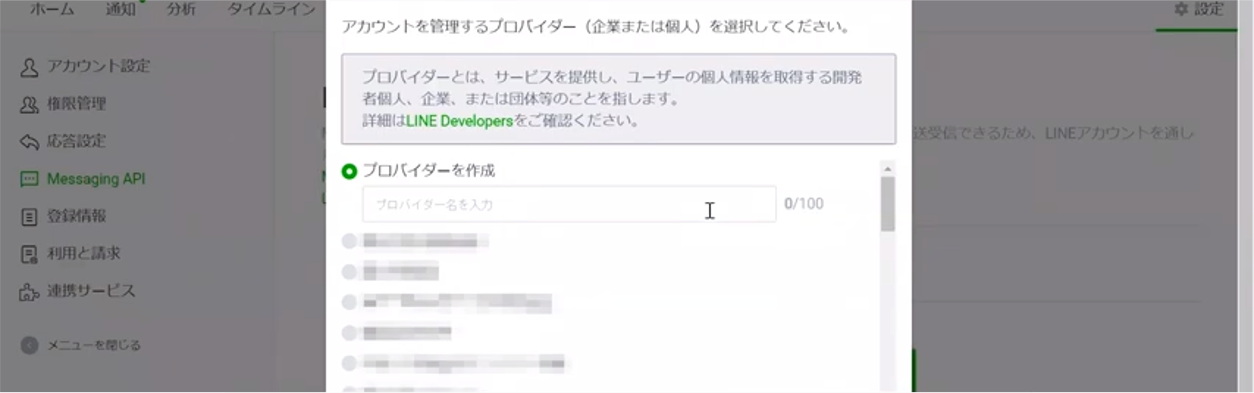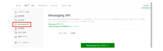 次に、左側メニューの真ん中にある「Messaging API」に進み、「Messaging APIを利用する」をクリックしてください。