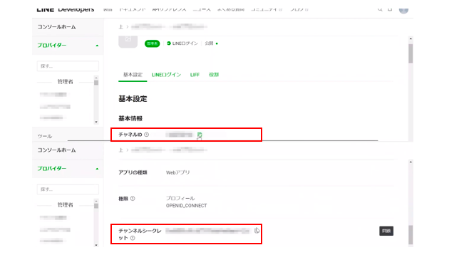 そしてここで、チャネルIDとチャンネルシークレットをコピーします。