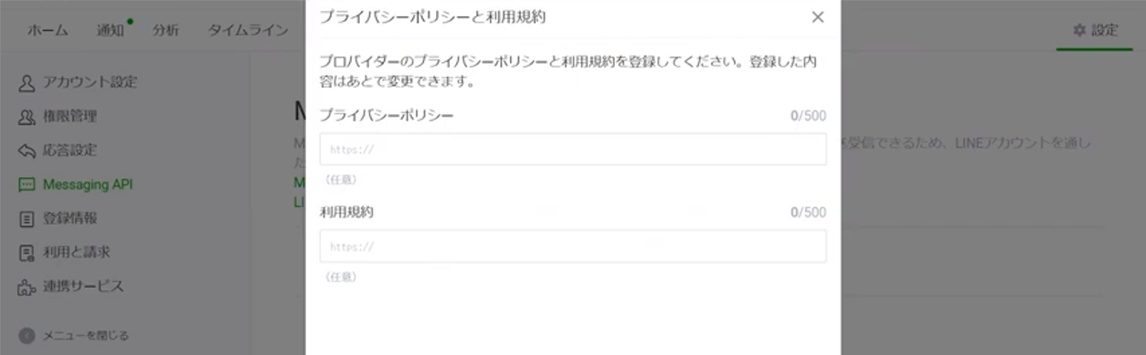 次にプライバシーポリシーと利用規約のURL入力欄が出てきますが、ここは任意なので、空白のまま次に進んで問題ありません。
