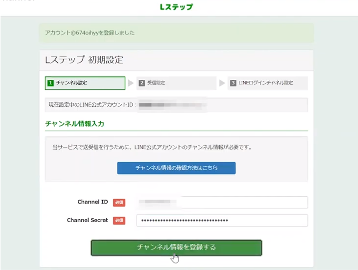 すると次の画面に、Channel IDとChannel Secretが出てきます。これを先ほどの「Lステップ初期設定」の画面にコピー&ペーストします。