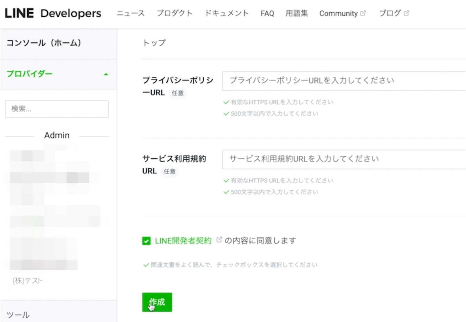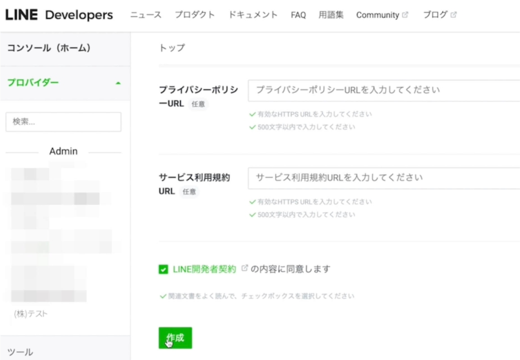 ここまで入力が完了したら「LINE開発者契約の内容に同意します」にチェックを入れて「作成する」をクリックします。