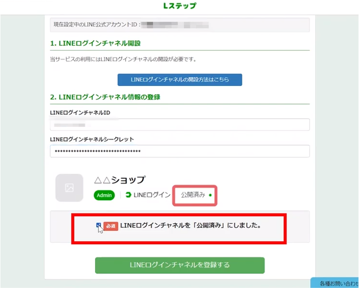チャンネルが「公開済み」になっていれば「LINEログインチャネルを「公開済み」にしました」へチェックを入れ、「LINEログインチャネルを登録する」をクリックしましょう。