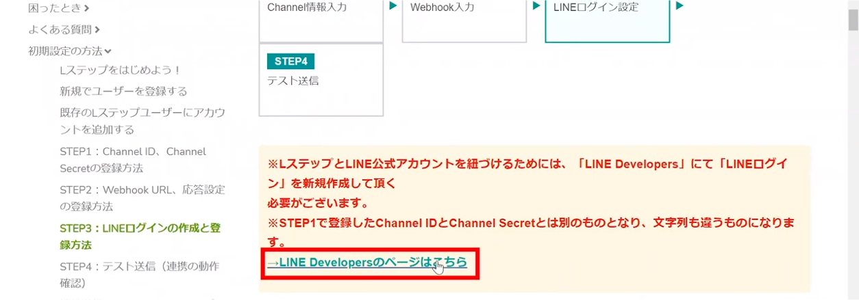ここではLINEログインチャネルを開設しますが、Lステップの画面に戻り「LINEログインチャネルの開設方法はこちら」をクリックしましょう。