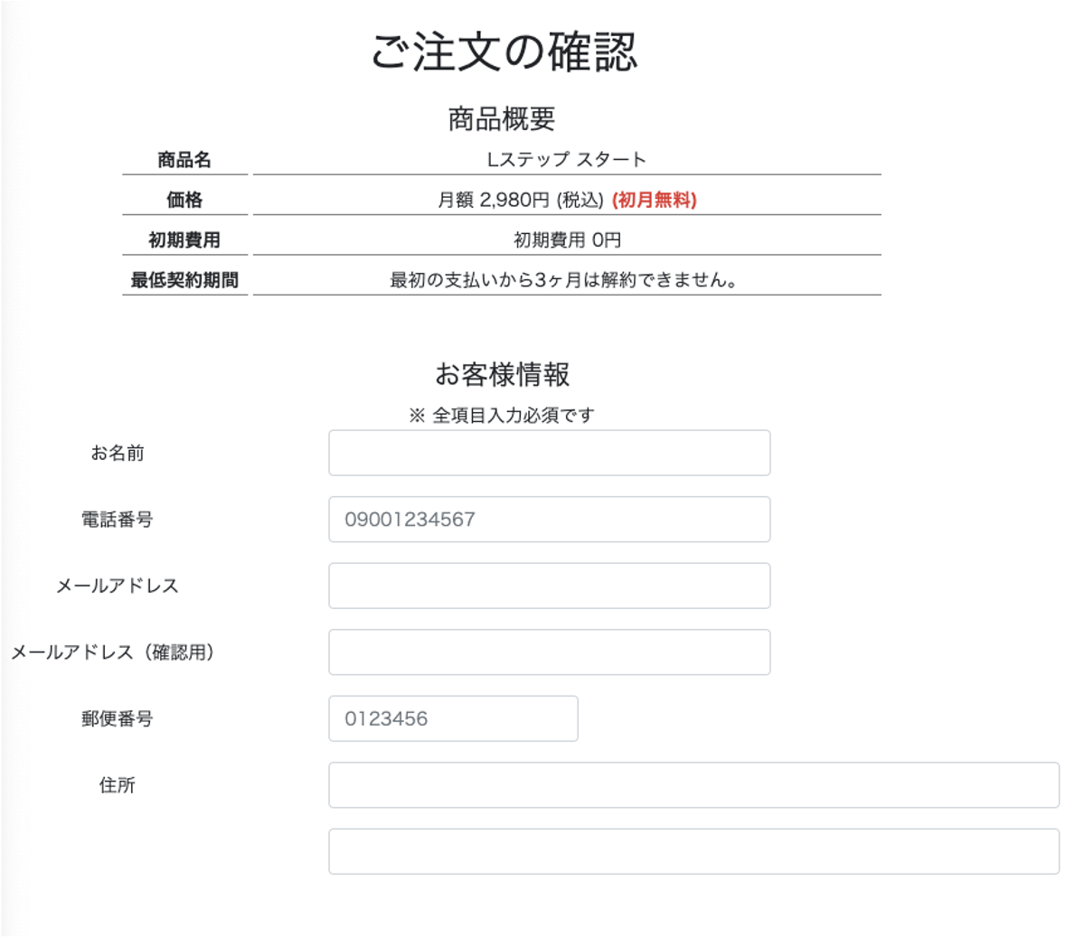 プランを選択たら、次は「ご注文の確認」画面で申し込み情報の入力を行います。