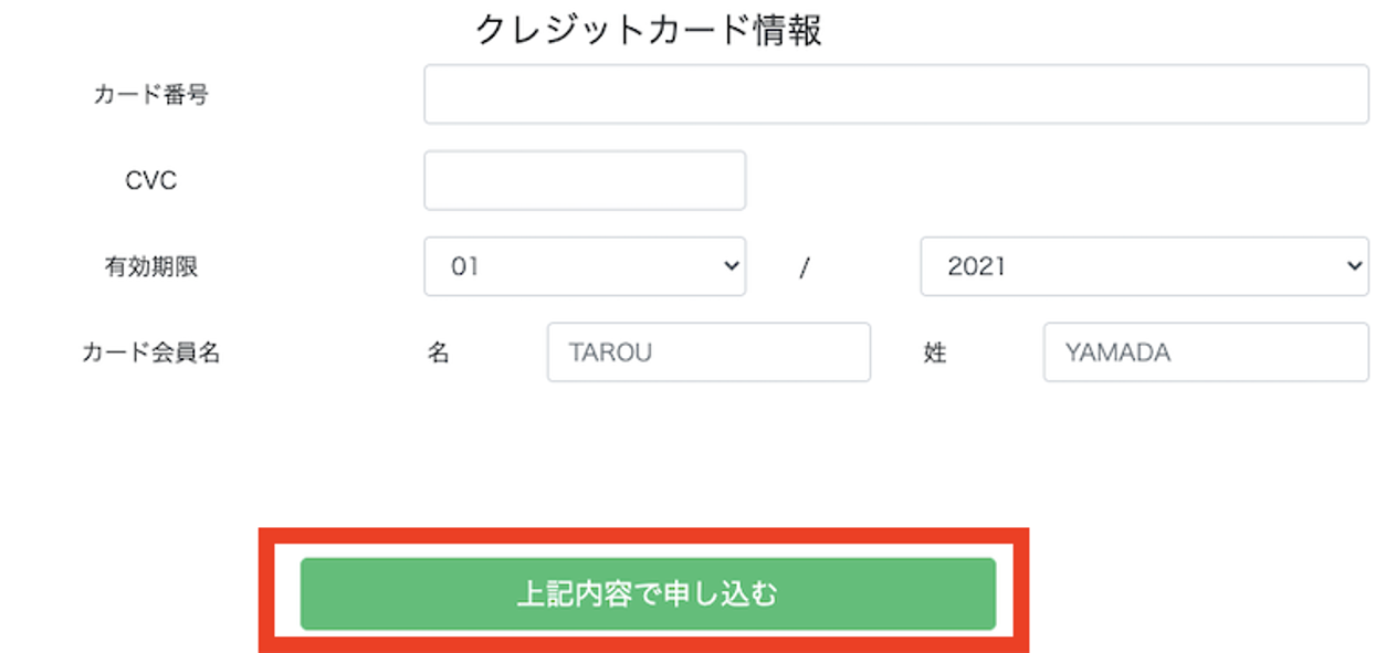 クレジットカード情報を入力し、最後に「上記内容で申し込む」をクリックすれば、申し込みの完了です!