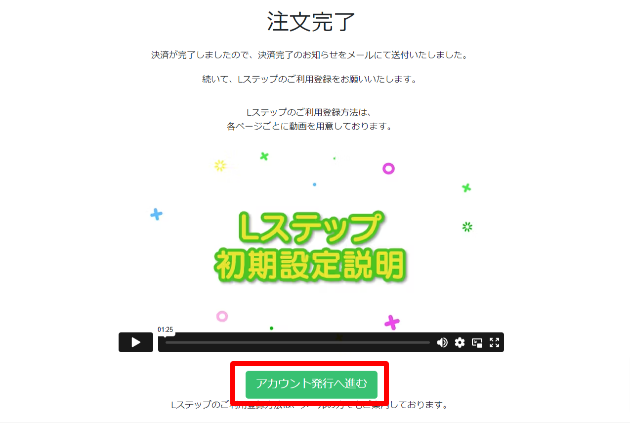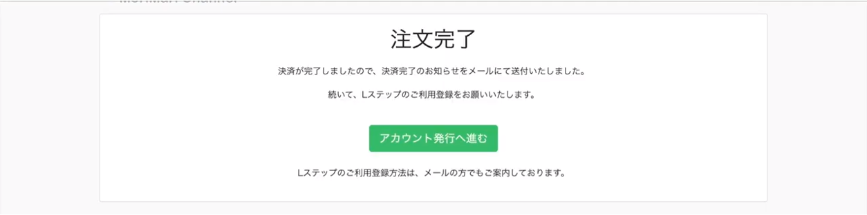まずは、Lステップ申し込み完了画面にて「アカウント発行へ進む」をクリックしてください。