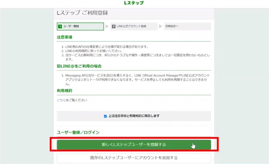 すると以下の「Lステップご利用登録」画面に遷移するので、「上記注意事項と利用規約に同意します」にチェックを入れ、下部の「新しくLステップユーザーを登録する」ボタンをクリックします。