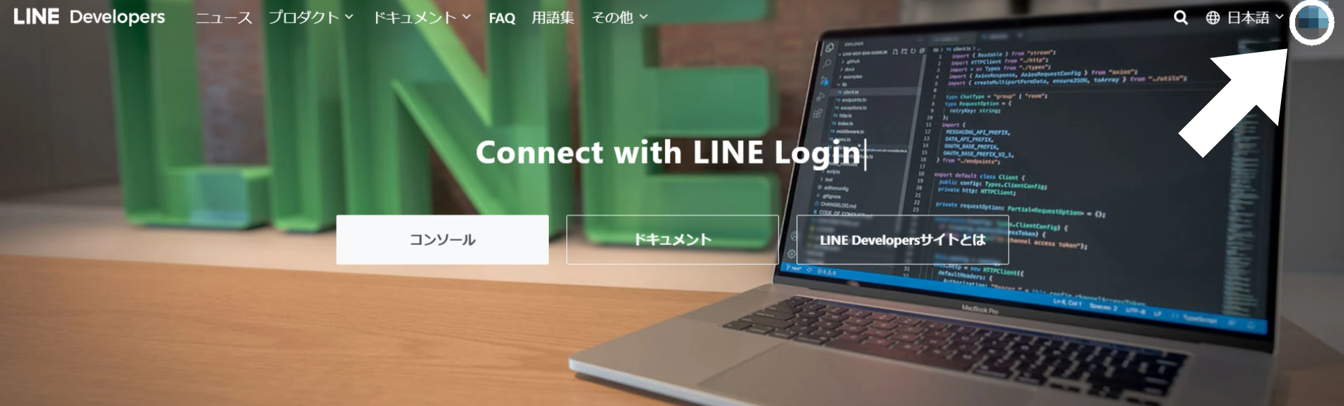 LINE Developersの画面に遷移したら、右上のアイコンをクリックします。