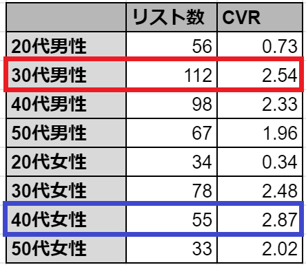 このデータを見ると確かにターゲットである30代男性のCVRは高いのですが、ここで注目したいのが40代の女性の項目です。