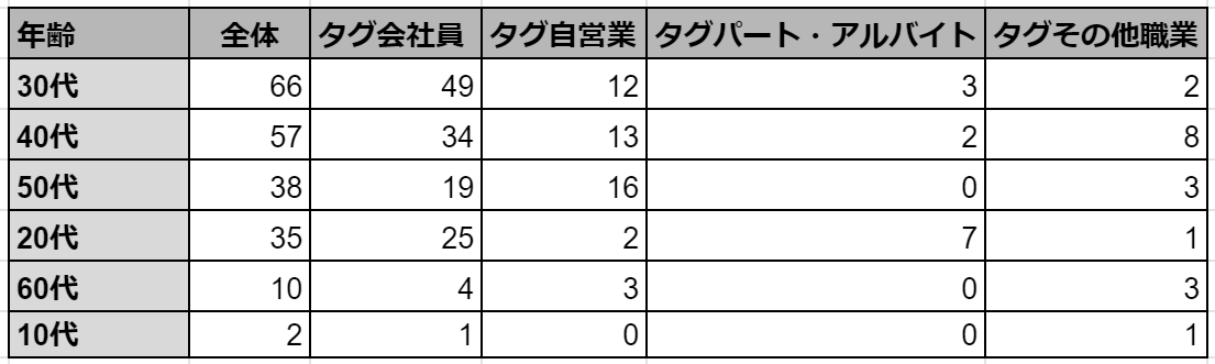 縦軸に年齢を取り、横軸に職業タグを取ったものですが、こうすることで読者の年代と職業の分布がわかりますね。例えば上記の図を見れば、取得したリストの中で最も多い属性は「30代の会社員」ということがわかります。